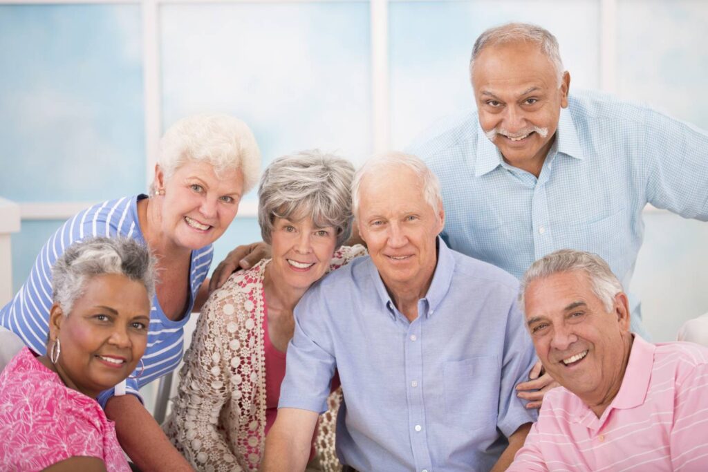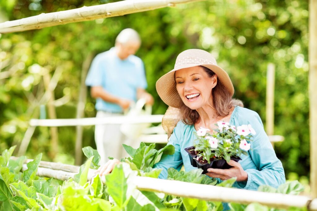 Senior man reading a book and smiling while sitting with a friend at a table in nursing houseDaily stretching exercise routine for a group of cheerful elderly people at an old age homeDaily stretching exercise routine for the elderly at an old age homeA young woman (grandaughter or caregiver) helps a senior couple prepare a meal in their residential kitchen.Happy senior woman planting flowers while man watering in background at garden. Horizontal shot.